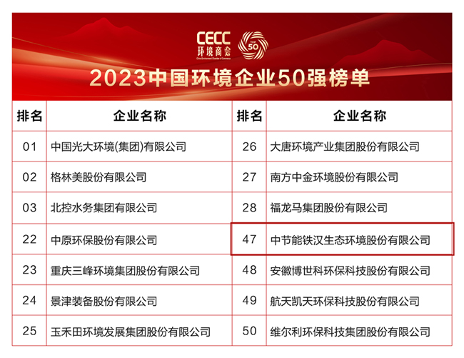 喜报 | 太阳成tyc122cc连续6年荣登“中国环境企业50强”榜单
