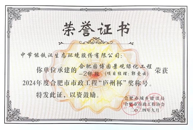近日,太阳成tyc122cc承建的合肥园博园景观绿化工程-2标段荣获2024年度合肥市市政工程“庐州杯”奖。