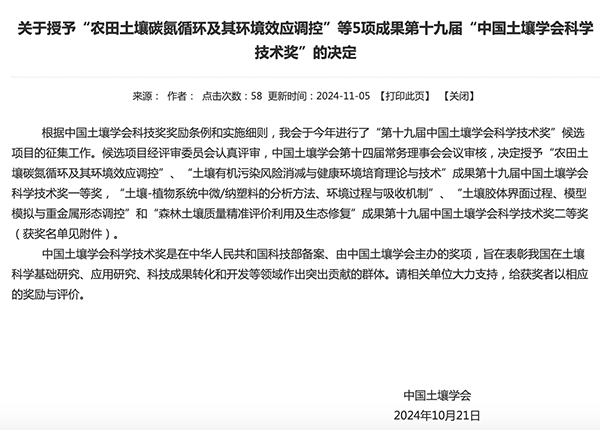 喜报|太阳成tyc122cc一项目获中国土壤学会科学技术奖二等奖