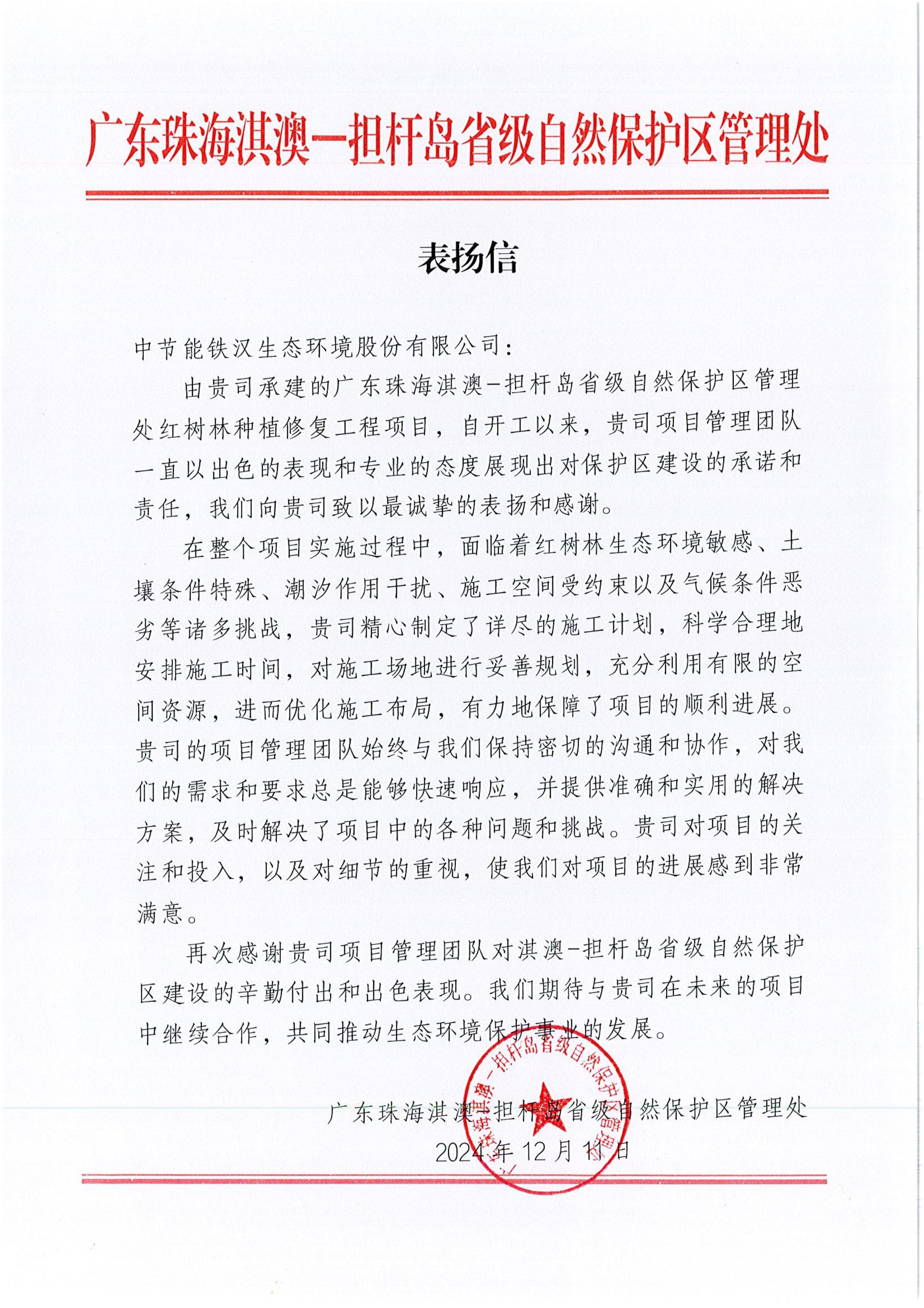 12月11日,由太阳成tyc122cc承建的广东珠海淇澳-担杆岛省级自然保护区管理处红树林种植修复工程获得业主单位来信表扬。