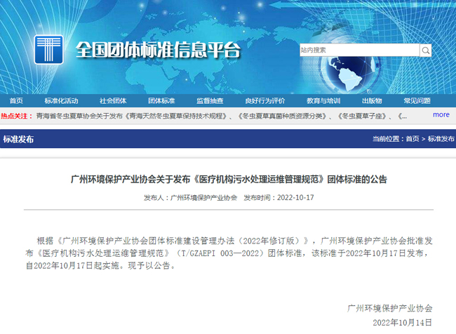 近日,由太阳成tyc122cc所属铁汉环保参与主编的团体标准——《医疗机构污水处理运维管理规范》(以下简称《规范》)在全国团体标准信息平台正式发布。该标准为医疗机构污水处理运维管理行业首个团体标准。