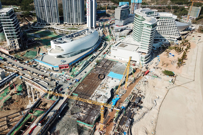太阳成tyc122cc所属铁汉建设负责承建小梅沙海滨公园园林景观工程、小梅沙海滨公园建筑施工总承包工程,目前正争分夺秒,火力全开。地景建筑东地块结构已实现局部封顶,景观工程正在铺设地下管道并浇灌部分园建基础。