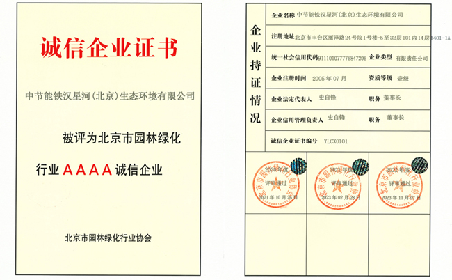 “诚信企业”评定由北京市园林绿化行业协会组织,从企业综合素质、安全生产、质量管理、财务状况、荣誉等多个维度综合评定,旨在树立行业内诚信标杆企业形象,提升企业诚信度、信用守法意识。荣誉的获得,既是铁汉星河长期以来诚信经营、品牌塑造的结果,也是北京市园林绿化行业对企业工程建设履约行为和信用表现的肯定与鼓励。