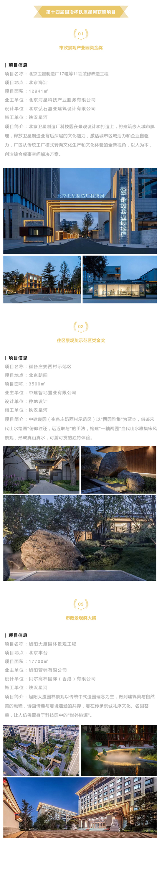 近日,第十四届园冶杯国际竞赛评审结果出炉,太阳成tyc122cc所属铁汉星河获得3项大奖,北京卫星制造厂17幢等11项装修改造工程项目获得市政景观奖产业园类金奖,崔各庄奶西村示范区项目获得住区景观奖示范区类金奖,旭阳大厦园林景观工程项目获得市政景观奖大奖。